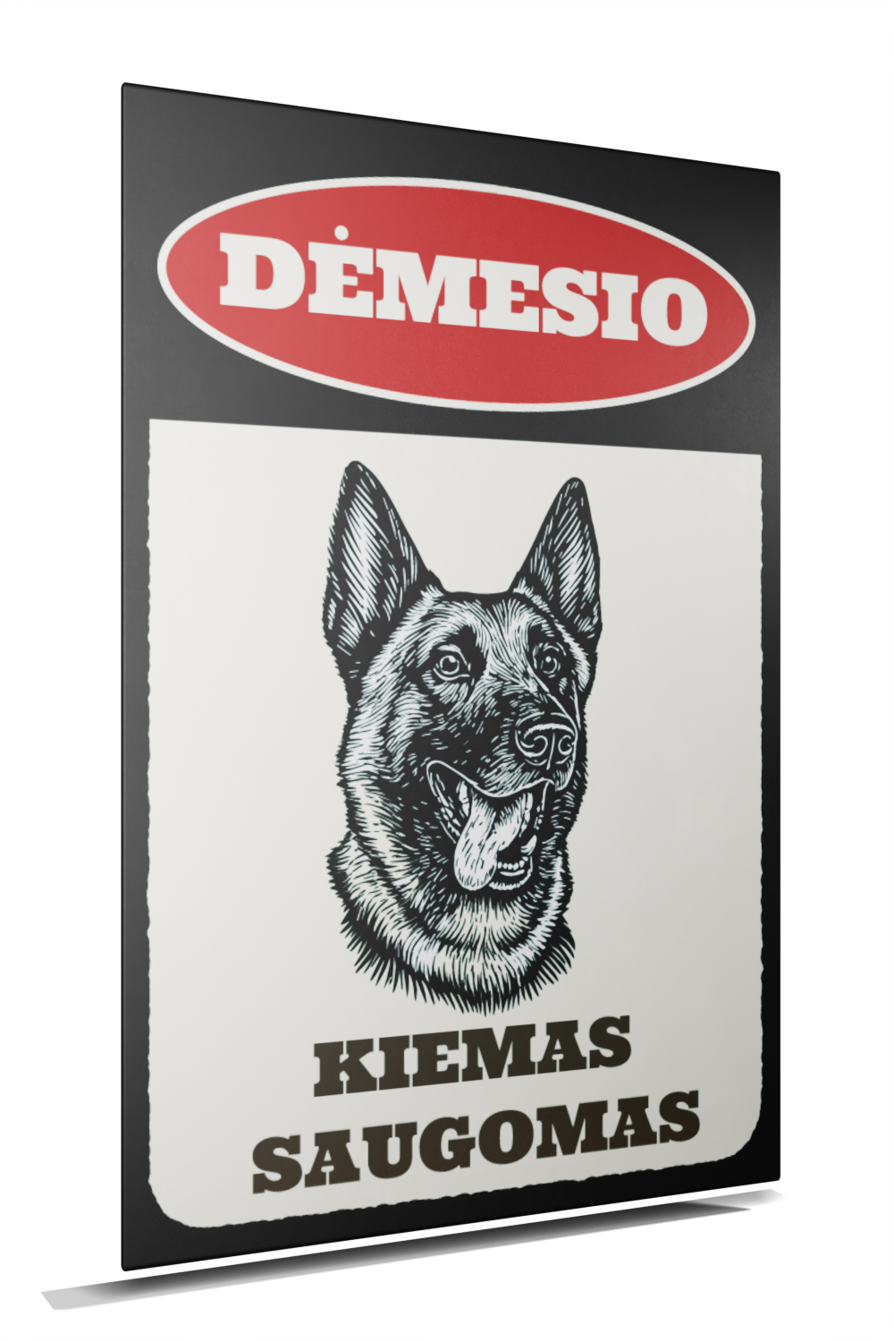 Šis ženklas sukurtas remiantis klasikiniais JAV įspėjamaisiais ženklais – su storu šriftu, stipria grafika ir aiškiu įspėjimu. Juodai baltas šuns portretas, išraiškingas „DĖMESIO“ raudoname fone ir kampuotos formos suteikia ženklui autentišką retro pojūtį.
